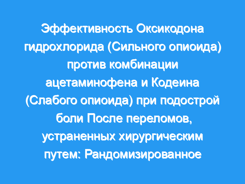 Проверить гипотезу о том, что сильные опиоиды обеспечивают большую анальгезию, чем легкие опиоиды, в течение первой недели после выписки из больницы после хирургического лечения переломов. Дизайн, условия и участники: Это двойное слепое рандомизированное клиническое исследование было проведено в крупном травматологическом госпитале с одним центром в Сиднее, Австралия. Участниками были стационарные пациенты, перенесшие острую непатологическую перелом длинной кости или таза, надколенника, пяточной кости или таранной кости, которые лечились с помощью хирургической фиксации и были зачислены с 27 июля 2016 года по 22 августа 2017 года. Данные были проанализированы с июня по октябрь 2018 года. Вмешательства: Начало при выписке оксикодона гидрохлорида 5 мг по 10 мг (т.е. 1 или 2 таблетки) или комбинации ацетаминофена и кодеина 500 мг и 8 мг или 1000 мг и 16 мг (т.е. 1 или 2 таблетки) 4 раза в день в течение максимальной продолжительности 3 недель. Основные результаты и меры: Первичным результатом было среднее значение ежедневных показателей боли, собранных в течение 1-й недели лечения, измеренное с использованием Числовой шкалы оценки боли (NRS). Участникам было предложено ежедневно оценивать свою среднюю боль за предыдущие 24 часа, используя балл NRS от 0 до 10, где 0 означало отсутствие боли, а 10 — наихудшую боль, которую можно себе представить. Ключевыми вторичными результатами были ответы на 5-уровневый опросник EuroQol 5-Dimension (EQ-5D-5L), сильнейшая боль, побочные эффекты от приема лекарств, глобальный воспринимаемый эффект и возвращение к работе.