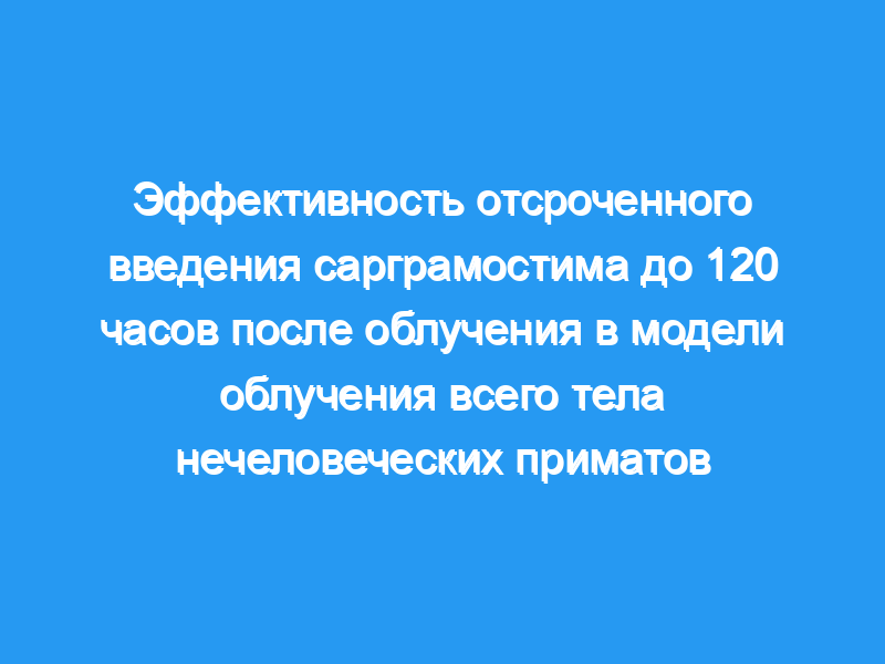 Отсроченное лечение сарграмостимом через 48 ч после облучения значительно снизило смертность (p = 0,0032) и улучшило гематологические показатели, включая количество нейтрофилов, а также лимфоцитов и тромбоцитов. Дополнительные задержки при введении сарграмостима через 72, 96 и 120 ч после облучения также были аналогично эффективны в повышении восстановления количества лимфоцитов, нейтрофилов и тромбоцитов по сравнению с контролем. Лечение сарграмостимом также улучшало выживаемость животных при введении в течение 96 часов после облучения. В то время как лечение сарграмостимом в течение 48 ч значительно снижало смертность, связанную с сепсисом (р ≤ 0,01), дополнительное профилактическое лечение азитромицином не имело клинически значимых эффектов.