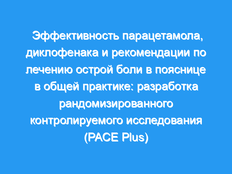 Исследование PACE Plus — это многоцентровое, плацебо-слепое, рандомизированное контролируемое исследование в первичной медико-санитарной помощи с последующим наблюдением в течение 12 недель. Будут включены пациенты с острой болью в пояснице в возрасте 18-60 лет, обращающиеся в общую практику. Пациенты рандомизированы на четыре группы: 1) Только рекомендации (обычный уход в соответствии с клиническими рекомендациями Голландской коллегии врачей общей практики), 2) Рекомендации и парацетамол, 3) Рекомендации и диклофенак, 4) Рекомендации и плацебо. Первичным результатом является интенсивность боли в пояснице, измеряемая с помощью числовой рейтинговой шкалы (0-10). Вторичные результаты включают соблюдение режима лечения, инвалидность, предполагаемое выздоровление, затраты, побочные реакции, удовлетворенность, качество сна, совместные вмешательства и адекватность ослепления. Различия между группами по интенсивности боли в пояснице будут оцениваться с использованием анализа повторных измерений с использованием моделей линейных эффектов. Экономическая оценка будет проведена с использованием анализа экономической эффективности с учетом интенсивности болей в пояснице и анализа затрат и полезности с учетом качества жизни. Будет проведен исследовательский анализ для оценки изменения эффекта с помощью заранее определенных переменных. Этическое одобрение было получено. Результаты исследования будут опубликованы в соответствующем рецензируемом журнале.