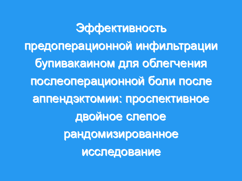 Проспективное рандомизированное двойное слепое исследование Исследование было проведено на 123 пациентах в возрасте 13-45 лет с предоперационным и послеоперационным диагнозом острого аппендицита, поступивших в больницу Сирирадж, Бангкок, с января по май 2002 года. Они были случайным образом разделены на две группы: контрольную (61 пациент) и преимущественную (62 пациента). В контрольной группе бупивакаин (маркаин) вводили в кожу и подкожную клетчатку вдоль предполагаемой линии раны до разреза сеткой, а также в мышечный слой после разреза.