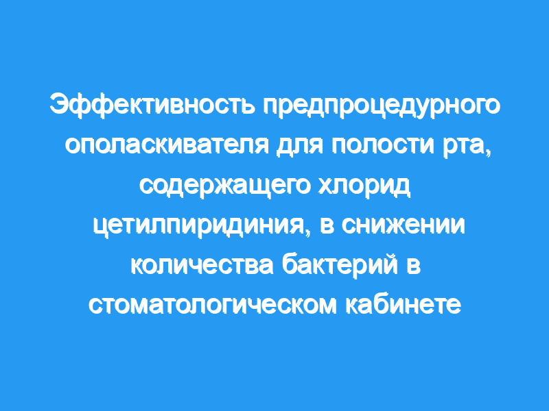 Во время оральных процедур микроорганизмы из полости рта могут загрязнять близлежащие поверхности. Авторы оценили эффективность коммерческого предпроцедурного ополаскивателя для полости рта, содержащего 0,05% цетилпиридиния хлорида (CPC), в снижении уровня и состава жизнеспособных бактерий в брызгах изо рта.