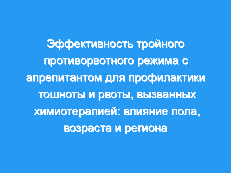Определить вариабельность лечебных реакций на противорвотную терапию (ондансетрон и дексаметазон в сравнении с ондансетроном и дексаметазоном плюс апрепитант), проводимую в сочетании с умеренно рвотной химиотерапией. План и методы исследования: Анализ подгрупп Post hoc данных рандомизированного двойного слепого клинического исследования III фазы оценивал, зависит ли эффективность тройной терапии апрепитантом (ондансетрон и дексаметазон плюс апрепитант) от контроля (ондансетрон и дексаметазон) в зависимости от пола, возраста или региона у 848 мужчин и женщин ≥18 лет с гистологически подтвержденными злокачественными новообразованиями и которые были наивны к химиотерапевтическим средствам средней или высокой рвотной активности. Конечными точками сравнения были случаи отсутствия рвоты, полного ответа и отсутствия применения спасательной терапии в течение всего периода (0-120 ч). Основные показатели результатов: Независимо от возраста, пола или региона, режим апрепитанта обеспечивал лучший контроль за конечными точками отсутствия рвоты и полного ответа (отсутствие рвоты, отсутствие спасательной терапии).