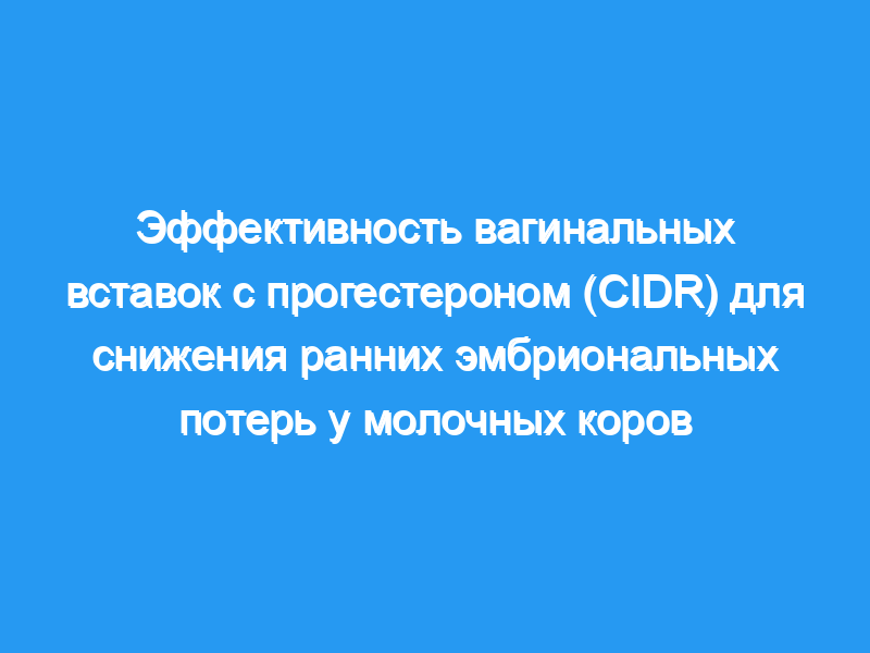 Общий показатель распространенности ранних эмбриональных потерь между 27 и 39 годами жизни составил 37,1% (группа CIDR® — 35,3%, контрольная группа — 38,9%, р=0,83). На d 39 p.i. 30,5% всех коров были беременны, и процент беременных коров не различался между исследуемыми группами (p=0,83). Уровни прогестерона на d 20 p.i. не различались между коровами, которые были беременны на d 39 p.i. (р=0,57). На 27 день внутривенно уровни прогестерона у беременных коров были выше в группе CIDR® (16,2 ± 9,9 нг/мл) по сравнению с контрольной группой (11,2 ± 3,4 нг/мл, р=0,04). Концентрации прогестерона были ниже на d 39 p.i., но все же различались между исследуемыми группами (р=0,05). После удаления CIDR® уровни прогестерона в крови не различались между беременными коровами обеих исследуемых групп на d 55 p.i. (p=0,36).