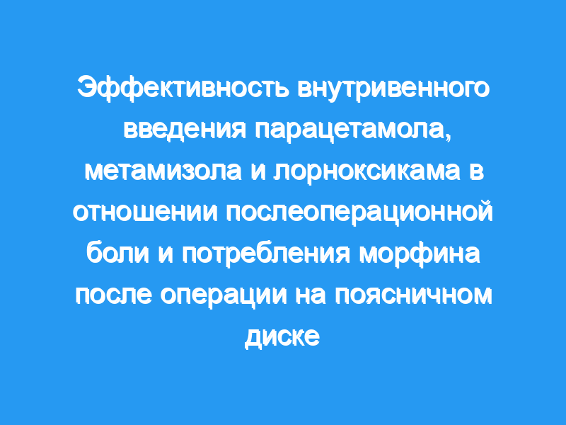 В этом проспективном плацебо-контролируемом рандомизированном двойном слепом исследовании сравнивалось влияние внутривенного введения метамизола, парацетамола и лорноксикама на послеоперационный контроль боли, потребление морфина и побочные эффекты после операции на поясничном диске. Восемьдесят пациентов с классификацией Американского общества анестезиологов 1 или 2, которым была назначена плановая операция на поясничном диске под общей анестезией, лечились с использованием контролируемой пациентом анальгезии морфином до 24 часов после операции и были рандомизированы для получения дополнительных внутривенных инъекций метамизола 1 г, парацетамола 1 г, лорноксикама 8 мг или изотонического физиологического раствора 0,9% (плацебо).. Первичной конечной точкой была боль в течение 24 ч после операции, измеренная по визуальной аналоговой шкале. Вторичными конечными точками были потребление морфина и побочные эффекты.