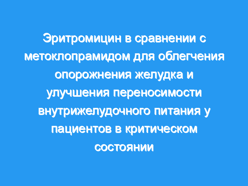 Цель этого исследования — оценить эффективность эритромицина в сравнении с метоклопрамидом для облегчения опорожнения желудка и толерантности к внутрижелудочковому энтеральному питанию (EN).