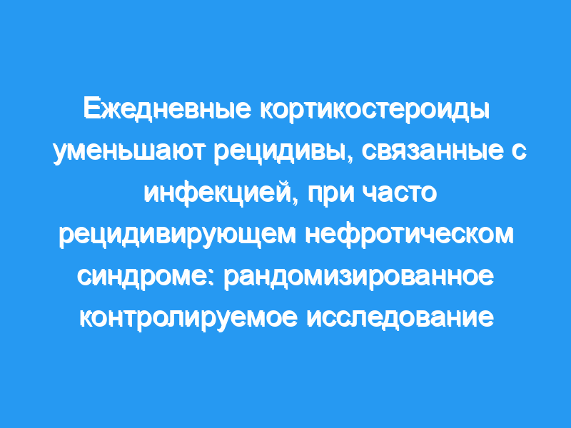 Предпосылки и цели: Рецидивы нефротического синдрома часто возникают после незначительных инфекций, обычно верхних дыхательных путей. Ежедневное введение поддерживающего преднизолона во время интеркуррентных инфекций было изучено, чтобы определить, снижает ли лечение частоту рецидивов у детей с часто рецидивирующим нефротическим синдромом. Дизайн, условия, участники и измерения: В рандомизированном контролируемом исследовании (слепой, параллельная группа, больница третичного уровня) 100 пациентов с идиопатическим, часто рецидивирующим нефротическим синдромом, которым назначалась длительная терапия низкими дозами преднизолона в течение дня с левамизолом или без него, были рандомизированы для получения их обычной дозы. чередующийся прием преднизолона ежедневно в течение 7 дней во время интеркуррентных инфекций (группа вмешательства) или продолжайте чередующийся прием преднизолона (контрольная группа). Первичный исход оценивали путем сравнения частоты рецидивов, связанных с инфекцией, при 12-месячном наблюдении. Вторичными исходами были частота инфекций и совокупное количество преднизолона, полученного в обеих группах.
