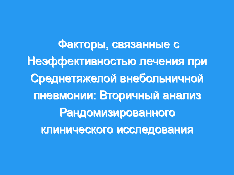 Оценить потенциальные факторы риска неудачи лечения у клинически стабильных пациентов с ВП. Дизайн, условия и участники: В этом вторичном анализе оцениваются данные рандомизированного клинического исследования CAP (Pneumonia Short Treatment [PTC] trial), проведенного с 19 декабря 2013 года по 1 февраля 2018 года. Анализ данных проводился с 18 июля 2019 года по 15 февраля 2020 года. Пациенты, госпитализированные в 1 из 16 центров во Франции по поводу ВП средней тяжести, которые были клинически стабильны на 3-й день лечения антибиотиками, были включены в исследование PTC и проанализированы в соответствии с протоколом исследования. Вмешательства: Пациенты были рандомизированы (1:1) на 3-й день лечения антибиотиками для получения β-лактама (амоксициллин-клавуланат [1 г/125 мг] 3 раза в день) или плацебо в течение дополнительных 5 дней. Основные результаты и меры: Основным исходом была неудача через 15 дней после первого приема антибиотиков, определяемая как температура выше 37,9 °C и/или отсутствие разрешения или улучшения респираторных симптомов и/или дополнительного лечения антибиотиками по любой причине. Связь между демографическими характеристиками, исходными клиническими и биологическими переменными, доступными (т.е. в первый день лечения β-лактамом), и неудачей лечения на 15-й день среди популяции в соответствии с протоколом исследования оценивалась с помощью одномерной и многомерной логистической регрессии.