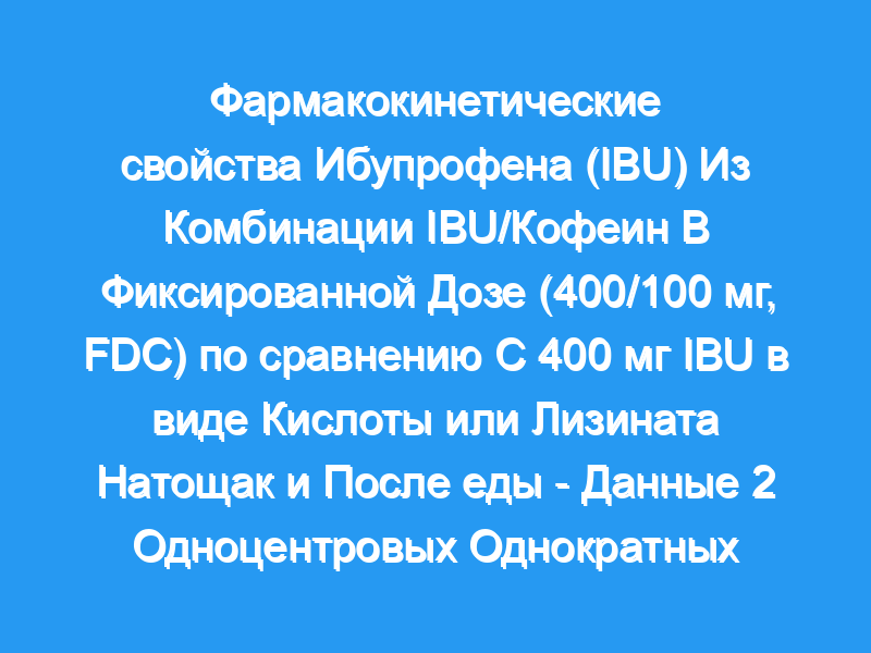 Мы исследовали новую комбинацию фиксированных доз (FDC) ибупрофеновой кислоты 400 мг и кофеина 100 мг в 2 однократных рандомизированных перекрестных исследованиях ПК у здоровых людей (оба N = 36). FDC сравнивали с 400 мг ибупрофена в виде кислоты и лизината после ночного голодания в исследовании 1 и с лизинатом ибупрофена после еды в исследовании 2. После голодания результаты применения ибупрофена в FDC были сопоставимы с результатами применения только ибупрофеновой кислоты.