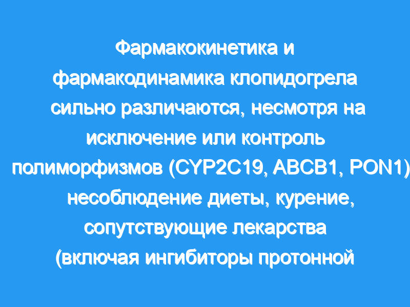 Фармакокинетика и фармакодинамика клопидогрела сильно различаются, несмотря на строгое исключение или контроль известных заболеваний, полиморфизмов (CYP2C19, CYP3A5, ABCB1, PON1), несоблюдение, сопутствующие лекарства, диету, курение, алкоголь, демографические данные и гиперреактивность тромбоцитов перед лечением. Таким образом, пока еще не идентифицированные факторы способствуют высокой реактивности тромбоцитов во время лечения с известным повышенным риском серьезных неблагоприятных сердечно-сосудистых событий. (Исследование влияния многократных доз Дексиансопразола, Лансопразола, Омепразола или Эзомепразола на фармакокинетику и фармакодинамику Клопидогрела у здоровых участников: NCT00942175).