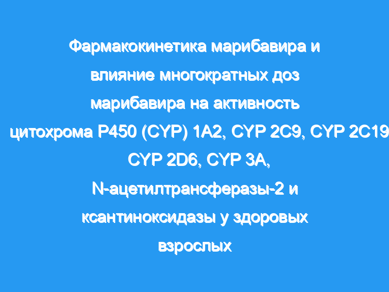 Фармакокинетика и безопасность марибавира, а также влияние марибавира на активность цитохрома Р450 (CYP) 1A2, CYP 2C9, CYP 2C19, CYP 2D6, CYP 3A, N-ацетилтрансферазу-2 (NAT-2) и ксантиноксидазу (XO) оценивали в рандомизированном двойном слепом плацебо-контролируемом исследовании.Двадцать здоровых испытуемых получили фенотипирующий коктейль из пяти препаратов, состоящий из кофеина (CYP 1A2, NAT-2, XO), варфарина плюс витамин К (CYP 2C9), омепразола (CYP 2C19), декстрометорфана (CYP 2D6) и мидазолама (CYP 3A) за 4 дня до и после 7 дней лечения марибавиром по 400 мг два раза в день (16 пациентов) или плацебо (4 пациента) в течение 10 дней.