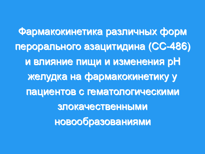 Исследование 1 оценивали различные пероральные препараты (таблетки с немедленным высвобождением [IRT], таблетки, покрытые кишечнорастворимой оболочкой, и капсулы, N = 16). В исследовании 2 оценивалось влияние пищи (Часть 1, N = 17) и модуляции рН желудка омепразолом (Часть 2, N = 14) на пероральный прием азацитидина PK. Профили зависимости концентрации азацитидина от времени в плазме для препаратов IRT и капсул были схожими, с более быстрым временем достижения максимальной концентрации в плазме (Tmax), чем в таблице, покрытой кишечнорастворимой оболочкой.