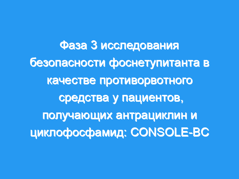 Фоснетупитант (FosNTP), антагонист рецепторов нейрокинина 1 для внутривенного введения, продемонстрировал благоприятный профиль безопасности с потенциально низким риском реакций в месте инъекции (ISR) и многообещающую противорвотную эффективность у пациентов, получающих высокоэметогенную химиотерапию на основе цисплатина в предыдущем исследовании фазы 2. Мы провели рандомизированное двойное слепое исследование безопасности для оценки профиля безопасности FosNTP, включая ISRs, у пациентов, получающих химиотерапию доксорубицином-циклофосфамидом или эпирубицином-циклофосфамидом (AC/EC).