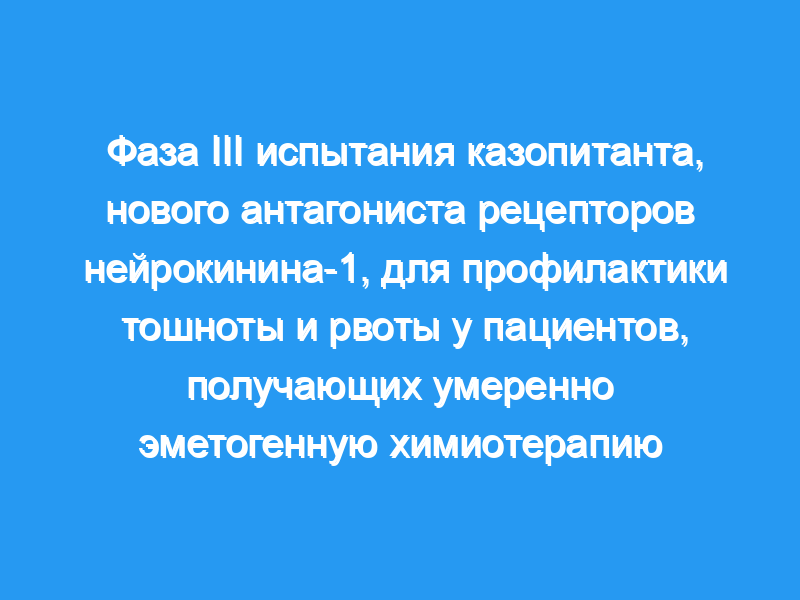 Целью этого исследования III фазы была оценка эффективности и безопасности схем, содержащих казопитант, новый антагонист рецептора нейрокинина-1, для профилактики тошноты и рвоты, вызванных химиотерапией, во время первого цикла у пациентов, получающих умеренно эметогенную химиотерапию (МЭК). Пациенты и методы: В это многонациональное рандомизированное двойное слепое плацебо-контролируемое клиническое исследование были включены преимущественно пациентки женского пола (98%) с диагнозом рак молочной железы (96%), которые не получали химиотерапию и должны были получать схему на основе антрациклина и циклофосфамида (AC). Все пациенты получали дексаметазон в дозе 8 мг внутривенно (внутривенно) в 1-й день и пероральный ондансетрон в дозе 8 мг два раза в день в 1-3-й дни. Пациенты были рандомизированы в контрольную группу (плацебо), группу казопитанта в однократной пероральной дозе (150 мг перорально [ПО] в 1-й день), 3-дневную группу казопитанта (150 мг перорально в 1-й день плюс 50 мг перорально в 2-3-й дни) или 3-дневную Внутривенное/пероральное введение казопитанта (90 мг внутривенно в 1-й день плюс 50 мг перорально в 2-3-й день). Первичной конечной точкой была доля пациентов, достигших полного ответа (отсутствие рвоты/позывов на рвоту или спасательных препаратов) в течение первых 120 часов после начала МЭК.