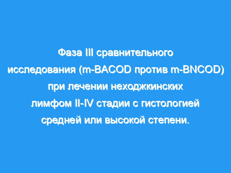 Целями исследования были сравнить эффективность и безопасность использования митоксантрона вместо доксорубицина в комбинированном химиотерапевтическом режиме m-BACOD (метотрексат в промежуточных дозах, блеомицин, адриамицин [доксорубицин, Adria Laboratories], циклофосфамид, Онковин [винкристин, Eli Lilly and Company] и дексаметазон). Семьдесят пациентов были рандомизированы для получения либо m-BN (Novantron, mitoxantron, American Cyanamid Company) COD, либо m-BACOD. Частота полного ответа составила 57% в обеих группах лечения, и между двумя группами не было зарегистрировано существенных различий в общей или безрецидивной выживаемости.