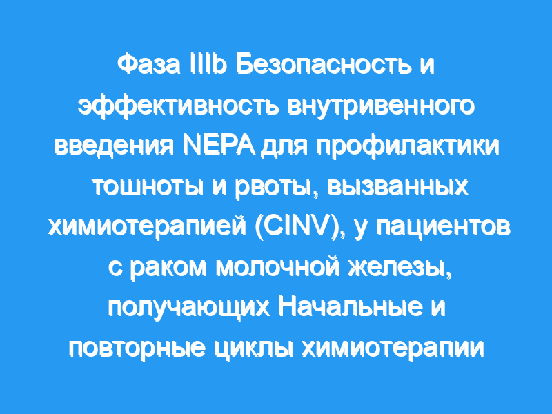 NEPA, комбинированное противорвотное средство, состоящее из антагониста рецепторов нейрокинина-1 (NK1) (RA) (нетупитант [перорально] /фоснетупитант [внутривенно, внутривенно]) и 5-HT3 RA, палоносетрон], обеспечивает 5-дневную профилактику CINV с помощью однократной дозы. Раствор Фоснетупитанта не содержит аллергенных вспомогательных веществ, поверхностно-активных веществ, эмульгаторов или усилителей растворимости. Исследование III фазы пациентов, получавших цисплатин, не выявило никаких реакций в месте инфузии или анафилактических реакций, связанных с внутривенным введением NEPA. Однако сообщалось о реакциях гиперчувствительности и анафилаксии при применении других внутривенных NK1 RAS, в частности фосапрепитанта, у пациентов, получавших химиотерапию на основе антрациклина-циклофосфамида (AC). В этом исследовании оценивалась безопасность и эффективность внутривенного введения NEPA в условиях переменного тока.