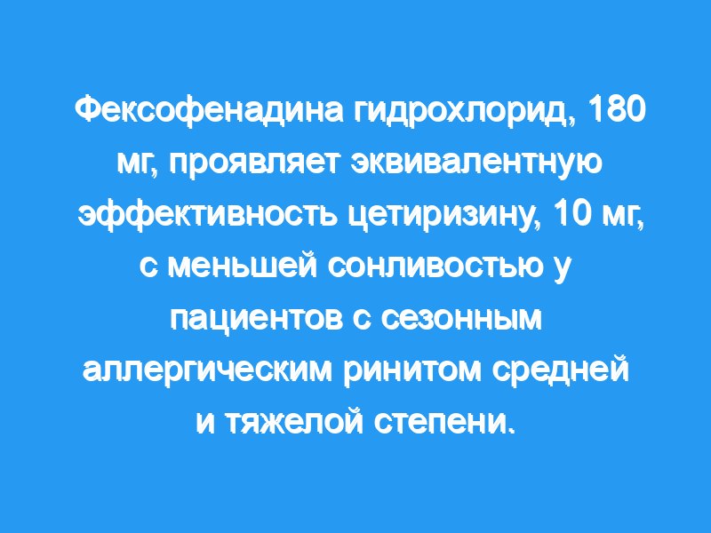 Один раз в день фексофенадина гидрохлорид, 180 мг, с учетом в течение 2 недель вызывал статистически и клинически эквивалентное улучшение симптомов и значительно меньшую сонливость по сравнению с исходным уровнем по сравнению с цетиризином в дозе 10 мг у пациентов с САР средней и тяжелой степени.