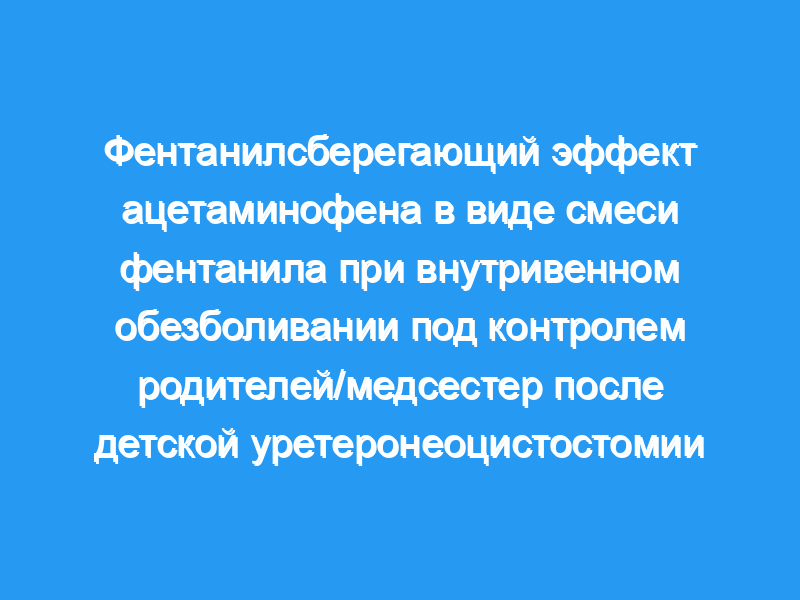 Хотя ацетаминофен широко используется и хорошо переносится детьми, его эффективность и безопасность не были выяснены в сочетании с опиоидом при внутривенном введении послеоперационной анальгезии, контролируемой родителями/медсестрой. Шестьдесят три ребенка (в возрасте от 6 до 24 месяцев), перенесшие плановую уретеронеоцистостомию, были включены в это проспективное рандомизированное двойное слепое исследование. После операции анальгетический насос был запрограммирован на подачу фентанила со скоростью базальной инфузии 0,25 microg.kg (-1).ч(-1) и 0,25 мкг/кг болюсно после нагрузочной дозы 0,5 мкг/кг(-1). В группе фентанил-ацетаминофен ацетаминофен вводили одновременно в виде смеси растворов со скоростью базальной инфузии 1,5 mg.kg (-1).ч(-1) и 1,5 мг/кг болюсно после нагрузочной дозы 15 мг/кг, тогда как группе фентанила вводили физиологический раствор.