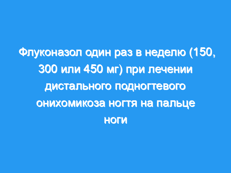 Результаты этого исследования подтверждают применение флуконазола при лечении дистального подногтевого онихомикоза ногтя на пальце ноги, вызванного дерматофитами. Дозы от 150 до 450 мг в неделю в течение 6 месяцев были клинически и микологически эффективными, а также безопасными и хорошо переносимыми.