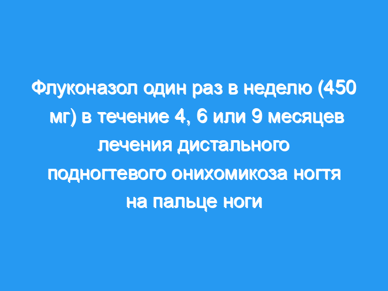 Целью этого исследования была оценка трех различных длительностей приема флуконазола один раз в неделю для лечения онихомикоза ногтей на ногах, вызванного дерматофитами. В многоцентровом рандомизированном двойном слепом параллельном плацебо-контролируемом исследовании 384 пациента с дистальным подногтевым онихомикозом ногтя на пальце ноги получали флуконазол в дозе 450 мг один раз в неделю или плацебо в течение 4, 6 или 9 месяцев. Для включения в исследование пациенты должны были иметь микологически подтвержденный дистальный подногтевой онихомикоз ногтя на пальце ноги с большим ногтем, клинически пораженным не менее чем на 25%, но имеющим не менее 2 мм здорового ногтя между ногтевой складкой и проксимальной границей онихомикоза. Эффективность оценивали по клиническим и микологическим (микроскопическим и микробиологическим) показателям при скрининге, при каждом посещении лечения, начиная с 3-го месяца, и через 2, 4 и 6 месяцев после терапии. Наблюдаемые или добровольно вызванные нежелательные явления регистрировались и классифицировались во время всех посещений.