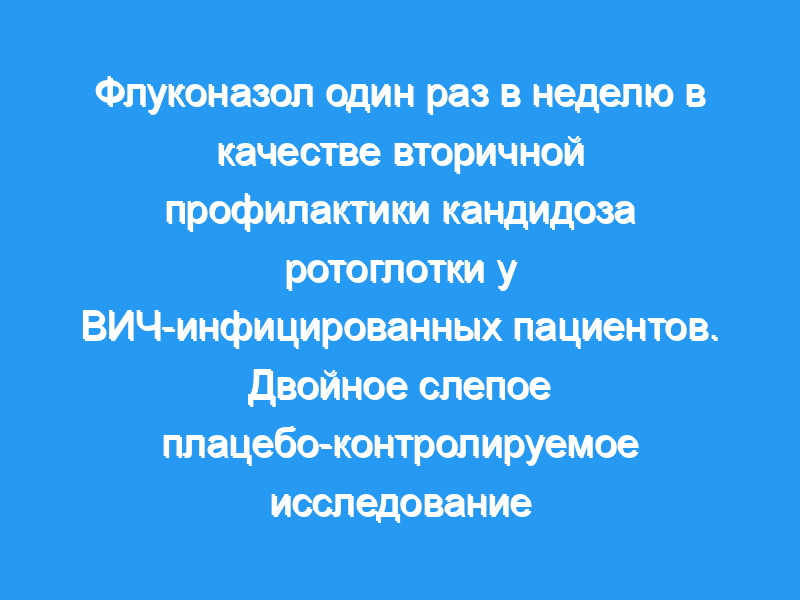 Оценить эффективность и переносимость флуконазола (пероральная доза 150 мг один раз в неделю) в профилактике рецидивирующего кандидоза ротоглотки у пациентов с инфекцией, вызванной вирусом иммунодефицита человека (ВИЧ) средней и тяжелой степени. Дизайн: Рандомизированное двойное слепое плацебо-контролируемое исследование. Пациенты: Восемьдесят четыре пациента с ВИЧ-инфекцией средней и тяжелой степени, которые успешно прошли двух-четырехнедельное лечение флуконазолом от кандидоза ротоглотки, были случайным образом распределены для получения либо плацебо, либо флуконазола. Клинические и лабораторные характеристики до начала лечения были одинаковыми в обеих группах. Показатели результата: Успех был классифицирован как отсутствие на протяжении всего курса лечения клинических признаков кандидоза ротоглотки, а неудача — как рецидив или рецидив симптоматического кандидоза ротоглотки.