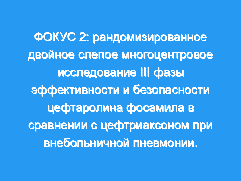Пациенты, госпитализированные в отделение не интенсивной терапии с CAP of Pneumonia Outcomes Research Group (PORT) III или IV класса риска, требующие внутривенной (iv) терапии, были рандомизированы (1:1) для получения 600 мг цефтаролина фосамила внутривенно каждые 12 ч или 1 г цефтриаксон внутривенно каждые 24 ч. Оценивали клиническое излечение, микробиологический ответ, нежелательные явления (НЯ) и лабораторные тесты. ФОКУС 2 регистрационный номер NCT00509106 (http://clinicaltrials.gov/ct2/show/NCT00509106 ).