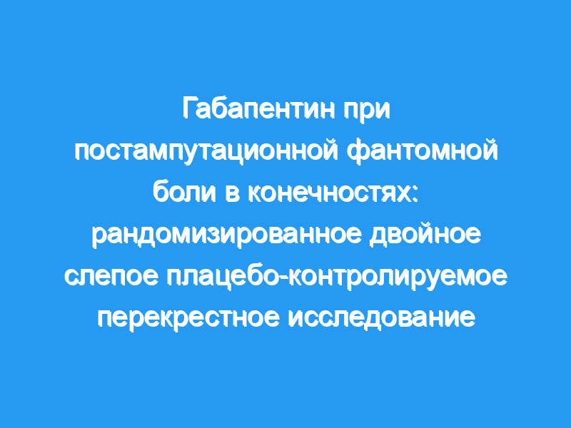 Пациенты, посещающие многопрофильную клинику боли с фантомными болями в конечностях, были включены в это рандомизированное двойное слепое плацебо-контролируемое перекрестное исследование. Другая противосудорожная терапия была прекращена. Каждая обработка длилась 6 недель, разделенных 1-недельным периодом вымывания. Кодеин/парацетамол были разрешены в качестве спасательной анальгезии. Суточную дозу габапентина титровали с шагом от 300 мг до 2400 мг или максимально переносимой дозы. Пациентов обследовали с еженедельными интервалами. Основным показателем результата была разница в интенсивности боли по визуальной аналоговой шкале (ВАШ) (PID) по сравнению с исходным уровнем в конце каждого лечения. Вторичными показателями были показатели нарушения сна, депрессии (шкала госпитальной тревоги и депрессии [HAD]) и активности повседневной жизни (индекс Бартела).
