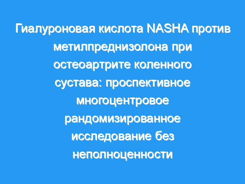 Сравнить гель с гиалуроновой кислотой NASHA в качестве однократного внутрисуставного (IA) лечения остеоартрита коленного сустава (ОА) с ацетатом метилпреднизолона (MPA). Дизайн: Это было проспективное, многоцентровое, рандомизированное, активно контролируемое, двойное слепое клиническое исследование без неполноценности. Для ответа на дальнейшие важные клинические вопросы была проведена уникальная фаза расширения с открытой маркировкой (OLE). Пациенты с болезненным односторонним ОА коленного сустава получали лечение и наблюдались в течение 26 недель (слепая фаза). Всем пациентам, обратившимся в клинику на 26 неделе, было предложено лечение NASHA с последующим 26-недельным периодом наблюдения (фаза продления). Основная цель состояла в том, чтобы показать неполноценность NASHA по сравнению с MPA в Индексе остеоартрита университетов Западного Онтарио и Макмастера (WOMAC) по показателю реакции на боль (процент пациентов с улучшением на ≥40% по сравнению с исходным уровнем по шкале WOMAC pain score и абсолютным улучшением на ≥5 баллов) через 12 недель.