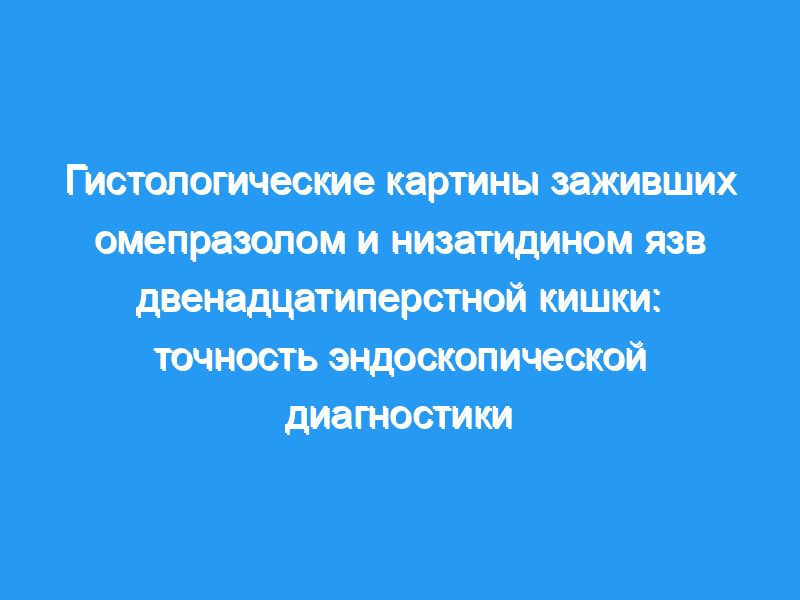 Мы лечили 31 пациента с ДУ в течение 4 недель либо омепразолом (20 мг ежедневно утром), либо низатидином (300 мг два раза в день). Показатели заживления в обеих группах не показали существенных различий (86,7% против 81,2%, р = 0,5). Хорошие показатели восстановления слизистой оболочки достоверно не различались (38,5% против 69,2% соответственно, р = 0,5). Согласие эндоскопистов по поводу типа рубца составило 0,80, с вероятностью согласия 0,70 (k = 0.34 +/- -0.08 ). Корреляция между макроскопическим и гистологическим видом рубцов была справедливой, но полностью значимой (r = 0,48, p < 0,05). Мы пришли к выводу, что исследование было слишком небольшим, чтобы обнаружить существенные различия в моделях заживления между двумя препаратами.