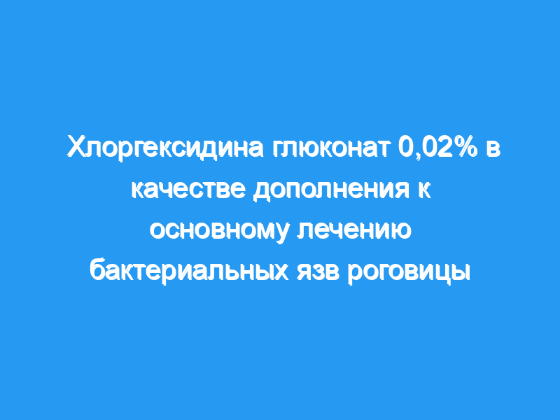 Изучить безопасность и эффективность хлоргексидина глюконата 0,02% в качестве дополнительной терапии бактериальных язв роговицы. Двадцать шесть пациентов с бактериальными язвами роговицы получали стандартное эмпирическое лечение антибиотиками. Основная группа получала хлоргексидин глюконат 0,02%, в то время как контрольная группа получала плацебо в течение одной недели. За пациентами наблюдали не менее 1 месяца.