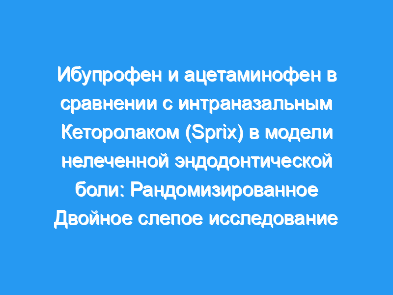 Ранее кеторолак был доступен для первичного применения только внутривенно и внутримышечно. Его доступность в интраназальной форме предлагает альтернативный способ введения, который пациенты могут вводить самостоятельно. Целью этого исследования было сравнить эффективность интраназального кеторолака (Sprix, Egalet US Inc, Уэйн, Пенсильвания) с комбинацией ибупрофена/ацетаминофена в модели острой боли у нелеченных эндодонтических пациентов, испытывающих умеренную или сильную боль и симптоматический апикальный периодонтит. В исследовании приняли участие семьдесят пациентов, испытывающих умеренную или сильную боль, пульпальный диагноз симптоматического необратимого пульпита или некроза и периапикальный диагноз симптоматического апикального периодонтита. Пациенты были случайным образом разделены на 2 группы и получали либо 31,5 мг интраназального кеторолака и капсулы плацебо, либо 1000 мг ацетаминофена/600 мг ибупрофена в капсулах и имитацию назального спрея. Пациенты регистрировали оценки воспринимаемой боли по визуальной аналоговой шкале каждые 15 минут с момента введения препарата до 240 минут. Время до 50%-ного облегчения боли, первые признаки облегчения боли и значимое облегчение боли были записаны, и данные были проанализированы.
