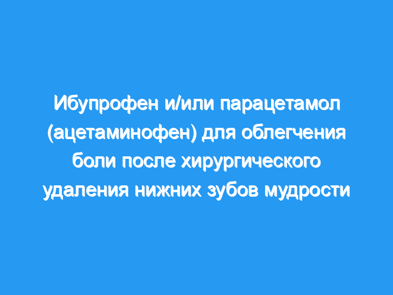И парацетамол, и ибупрофен являются широко используемыми анальгетиками для облегчения боли после хирургического удаления нижних зубов мудрости (третьих коренных зубов). В 2010 году в Соединенном Королевстве был выпущен новый анальгетик (продаваемый как Nuromol), содержащий парацетамол и ибупрофен в одной таблетке. На сегодняшний день этот препарат показал многообещающие результаты, и мы решили также сравнить комбинированный препарат с отдельными препаратами, использующими эту модель. В этом обзоре мы исследовали оптимальные дозы как парацетамола, так и ибупрофена путем сравнения обоих препаратов и сравнения с новым комбинированным препаратом. Мы приняли во внимание профиль побочных эффектов исследуемых препаратов. Этот обзор поможет челюстно-лицевым хирургам принять решение о том, какой анальгетик назначить после удаления зуба мудрости.