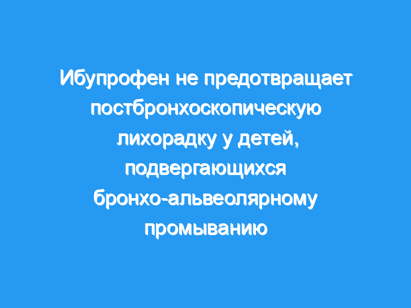 Волоконно-оптическая бронхоскопия (FOB) нижних дыхательных путей — это рутинное обследование, проводимое для изучения различных респираторных жалоб у детей. Распространенным побочным эффектом является кратковременная высокая температура в день введения препарата. Такие эпизоды обычно не связаны с инфекционным процессом, но могут вызывать клиническую неопределенность и беспокойство родителей. Ранее мы показали, что однократная доза системного дексаметазона значительно снижает частоту лихорадки после бронхоскопии (FPB). Исследовательский вопрос: Провести перспективный анализ влияния профилактической дозы ибупрофена на ФПБ. План и методы исследования: Дети, обратившиеся для планового FOB и бронхо-альвеолярного лаважа (BAL), были рандомизированы двойным слепым методом для получения однократной дозы сиропа ибупрофена 10 мг/кг или плацебо перед процедурой. На следующий день с родителями связались, чтобы зафиксировать наличие или отсутствие лихорадки.