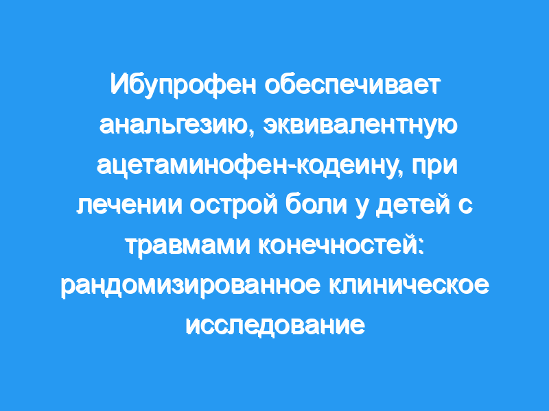 Это было рандомизированное двойное слепое исследование эквивалентности. Педиатрические пациенты с ЭД в возрасте от 5 до 17 лет с острой травматической болью в конечностях получали ацетаминофен-кодеин (1 мг/кг в виде кодеина, максимум 60 мг) или ибупрофен (10 мг/кг, максимум 400 мг). Пациенты представили оценки боли по Цветовой аналоговой шкале (CAS) в исходном состоянии и через 20, 40 и 60 минут после введения лекарства. Первичным измеренным результатом была разница в изменении оценки боли через 40 минут по сравнению с ранее описанным минимальным клинически значимым изменением оценки боли в 2 см. Разница была определена как (изменение показателя CAS ибупрофена по сравнению с исходным уровнем) — (изменение показателя CAS ацетаминофен-кодеина по сравнению с исходным уровнем), отрицательные значения, таким образом, в пользу группы ибупрофена. Дополнительные исходы включали необходимость в экстренном лечении и побочные эффекты.