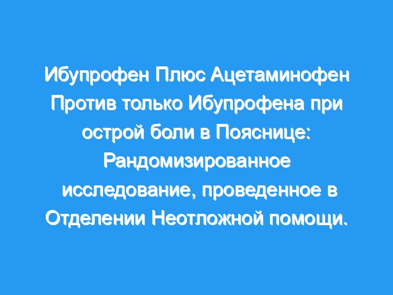 Пациентов с болями в пояснице (LBP) часто лечат нестероидными противовоспалительными препаратами (НПВП). НПВП умеренно эффективны при LBP, но многие пациенты с LBP продолжают страдать, несмотря на лечение этими препаратами. Мы сравнили болевые и функциональные исходы через 1 неделю после выписки из отделения неотложной помощи (ЭД) среди пациентов, рандомизированных на 1-недельный курс ибупрофена плюс ацетаминофен, по сравнению с ибупрофеном плюс плацебо.
