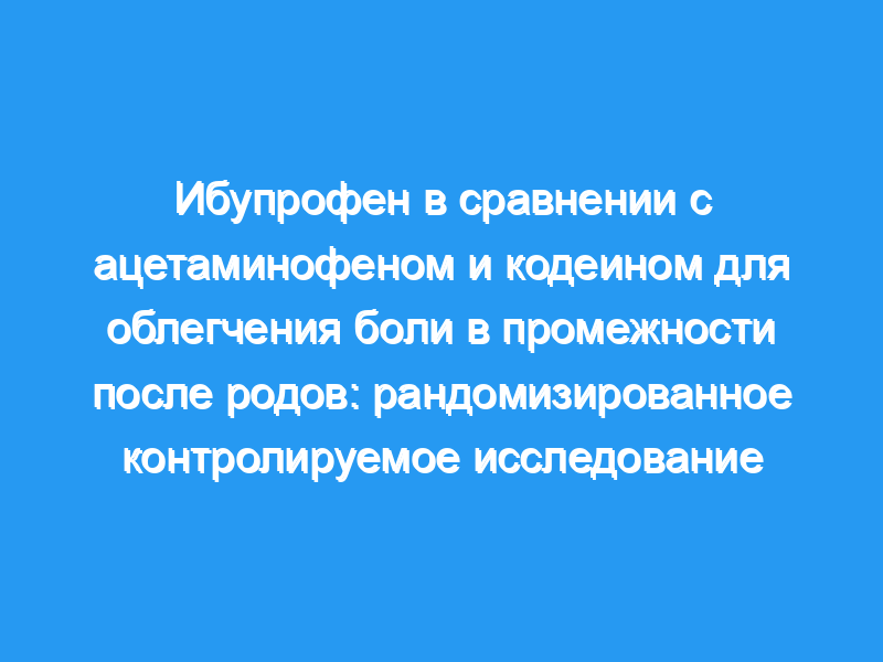 В общей сложности 237 женщин, родивших вагинально с эпизиотомией или разрывом третьей или четвертой степени в период с августа 1995 по ноябрь 1996 года в учебном и консультативном центре акушерской помощи высшего уровня в Ванкувере, были случайным образом распределены на прием ибупрофена (400 мг) (n = 127) или ацетаминофен (600 мг) с кодеином (60 мг) и кофеином (15 мг) (Тайленол № 3) (n = 110), оба вводятся перорально каждые 4 часа по мере необходимости. Оценки боли регистрировали до первой дозы и через 1, 2, 3, 4, 12 и 24 часа после первой дозы по 10-сантиметровой визуальной аналоговой шкале. Побочные эффекты и общее мнение оценивались через 24 часа.