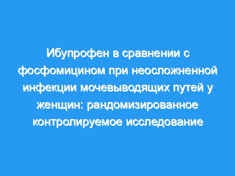 Женщины в возрасте 18-65 лет с типичными симптомами ИМП и без факторов риска или осложнений были набраны в 42 немецких клиниках общей практики и рандомизированы для лечения однократной дозой фосфомицина 3 г (n=246, проанализировано 243) или ибупрофена 3 × 400 мг (n=248, 241 проанализированный) в течение трех дней (и соответствующие манекены с плацебо в обеих группах). В обеих группах впоследствии было назначено дополнительное лечение антибиотиками по мере необходимости при стойких, ухудшающихся или рецидивирующих симптомах. Первичными конечными точками были количество всех курсов лечения антибиотиками на 0-28-й день (при ИМП или других состояниях) и тяжесть симптомов на 0-7-й день. Оценка симптомов включала дизурию, частоту/срочность и боль в нижней части живота. Изучите ответ и ограничения: 248 женщин в группе ибупрофена получали значительно меньшее количество курсов антибиотиков, имели значительно более высокое общее бремя симптомов и чаще страдали пиелонефритом. Произошло четыре серьезных нежелательных явления, которые привели к направлению в больницу, одно из них потенциально было связано с испытуемым препаратом. Результаты должны интерпретироваться с осторожностью, поскольку они могут относиться к женщинам с симптомами легкой и средней степени тяжести, а не ко всем пациентам с неосложненной ИМП. Что добавляет эта статья: Две трети женщин с неосложненной ИМП, получавших симптоматическое лечение ибупрофеном, выздоравливали без каких-либо антибиотиков. Начальное симптоматическое лечение — это возможный подход, который следует обсудить с женщинами, желающими избежать немедленного назначения антибиотиков и принять несколько более тяжелое бремя симптомов. Финансирование, конкурирующие интересы, обмен данными: Федеральное министерство образования и исследований Германии (BMBF) № 01KG1105. Данные об уровне пациента доступны у соответствующего автора. Согласие пациента получено не было, но данные анонимизированы, и риск идентификации невелик.Регистрационный номер клинического испытания: Идентификатор NCT01488955.
