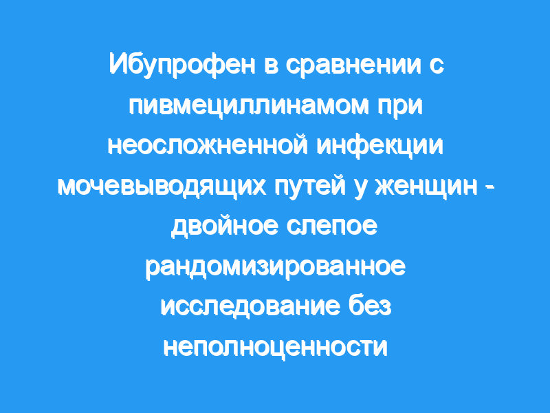 Хотя неосложненные инфекции мочевыводящих путей (ИМП) часто самоограничиваются, большинству пациентов будет назначено лечение антибиотиками. Мы оценили, не уступает ли лечение ибупрофеном пивмециллинаму в достижении разрешения симптомов к 4-му дню, с погрешностью в 10%. Методы и результаты: Это было рандомизированное, контролируемое двойное слепое исследование без неполноценности. Мы набрали пациентов из 16 клиник общей практики в Норвегии, Швеции и Дании. Небеременные женщины в возрасте 18-60 лет с симптомами неосложненной ИМП проходили скрининг на соответствие критериям с 11 апреля 2013 года по 22 апреля 2016 года. Пациенты с информированным согласием были рандомизированы (соотношение 1:1) на лечение либо 600 мг ибупрофена, либо 200 мг пивмециллинама 3 раза в день в течение 3 дней. Пациент, лечащий врач и персонал исследования были ослеплены распределением лечения. Первичным результатом была доля пациентов, которые чувствовали себя выздоровевшими к 4-му дню, согласно оценке из дневника пациента. Вторичные исходы включали долю пациентов, нуждающихся во вторичном лечении антибиотиками, и случаи пиелонефрита. В общей сложности 383 женщины были рандомизированы на лечение либо ибупрофеном (n = 194, проанализирована 181), либо пивмециллинамом (n = 189, проанализировано 178). К 4-му дню 38,7% пациентов в группе ибупрофена почувствовали себя излеченными по сравнению с 73,6% в группе пивмециллинама. Скорректированная разница в риске с 90% доверительным интервалом составила 35% (от 27% до 43%) в пользу пивмециллинама, который пересек заранее определенную границу неполноценности. Вторичные конечные точки, как правило, были в пользу пивмециллинама. После 4-недельного наблюдения 53% пациентов в группе ибупрофена выздоровели без лечения антибиотиками. Произошло семь случаев пиелонефрита, все в группе ибупрофена, что дает число, необходимое для причинения вреда, равное 26 (95% ДИ от 13 до 103). Пять из этих пациентов были госпитализированы и классифицированы как имеющие серьезные побочные эффекты, 2 выздоровели амбулаторно. Ограничением исследования был обширный список критериев исключения, исключавший почти половину обследованных пациентов. Мы не регистрировали симптомы в процессе скрининга, следовательно, мы не знаем бремени симптомов у тех, кто отказался от участия. Это может сделать наши результаты менее обобщаемыми.