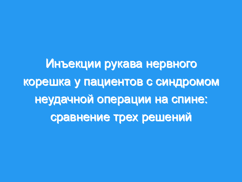 Оценить исход у пациентов с синдромом неудачной операции на спине, получавших инъекции рукава нервного корешка. Дизайн и пациенты: Открытое, слепое, рандомизированное исследование на 60 пациентах с документированным фиброзом менее чем в трех нервных корешках. Вмешательства: После случайного отбора 20 пациентам вводили 1 мл бупивакаина 0,5% в сочетании с 1500 ед гиалуронидазы и 1 мл физиологического раствора на рукав нервного корешка (группа А), еще 20 получали 1 мл бупивакаина 0,5% в сочетании с 40 мг раствора метилпреднизолона (Депо Медрол) на нервный корешок (группа В), а третью группу лечили 0,5%-ным бупивакаином в сочетании с 1500 ед гиалуронидазы и 40 мг раствора метилпреднизолона (группа С). Объем каждой инъекции составлял 2 мл. Инъекции делали дважды с интервалом в 1 неделю. Итоговые показатели: Пациенты были оценены по вербальной шкале оценки боли через 1, 3 и 6 месяцев после второй инъекции. Для выявления статистически значимых различий между тремя группами использовался критерий Крускала-Уоллиса, а анализ был уточнен с помощью критерия Фридмана. Результаты и выводы: В целом, хотя инъекции вызывали обезболивание через 1 месяц, эти эффекты были уменьшены при 3- и 6-месячном наблюдении. Не было обнаружено статистических различий между тремя группами лечения (через 1 месяц, р = 0,71, через 3 месяца, р = 0,69, через 6 месяцев, р = 0,66. Тест Фридмана показал значительное снижение оценки лечения в зависимости от времени в группах В и С (р = 0,015), но не в группе А (р = 0,074). Кортикостероиды, по-видимому, ответственны за последнее явление.