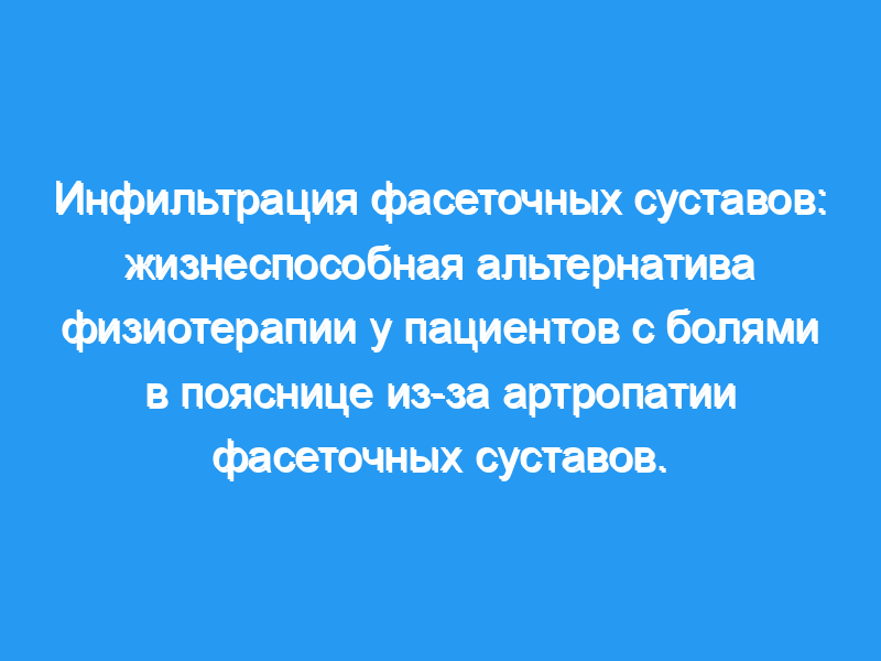 Все пациенты с клинической болью в пояснице (LBP) и МРТ-признаками FJA были отобраны в это проспективное исследование случайным образом. Все пациенты с FJI получали депо метилпреднизолона, а пациенты с физиотерапией получали режим Маккензи. Анкеты результатов, включающие оценки индекса инвалидности Освентри (ODI), визуальные аналоговые оценки (VAS) и оценки удовлетворенности пациентов (PSS), были заполнены при всех посещениях клиники. Наблюдение в обеих группах продолжалось в течение 6 месяцев. Результаты были проанализированы с использованием SPSS 17.0. Результат: Было 10 пациентов с FJI и 8 пациентов с физиотерапией (1,25: 1). Итоговые баллы включали следующие ODI, VAS и PSS. Группа FJI имела лучший результат по сравнению с группой физиотерапии при краткосрочной оценке, и эта разница была статистически значимой. Пациентки обеих групп чувствуют себя лучше по сравнению с мужчинами.