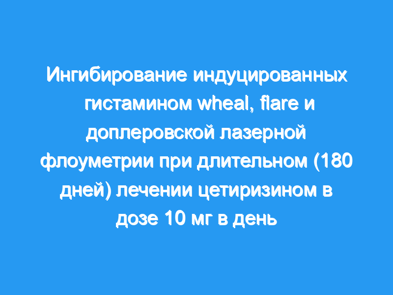 Целью исследования была оценка реактивности микроциркуляции кожи после введения гистамина у пациентов, получавших цетиризин в дозе 10 мг в день в течение 180 дней. Двадцать шесть пациентов, страдающих персистирующим ринитом (28+11 лет), были рандомизированы в две группы, которые получали цетиризин в дозе 10 мг/сут или плацебо соответственно. Двадцать пациентов завершили исследование. Реакцию микроциркуляции кожи после введения гистамина в дозе 10 мг/мл оценивали визуально на предплечье (диаметр волдырей и бликов) и с помощью лазерной доплеровской флоуметрии до и после введения исследуемого препарата или плацебо через 24 часа и каждые 30 дней во время исследования. Кровоток измеряли с помощью Periflux PF3, используя кожный зонд на расстоянии 5 мм от точки, индуцированной гистамином.