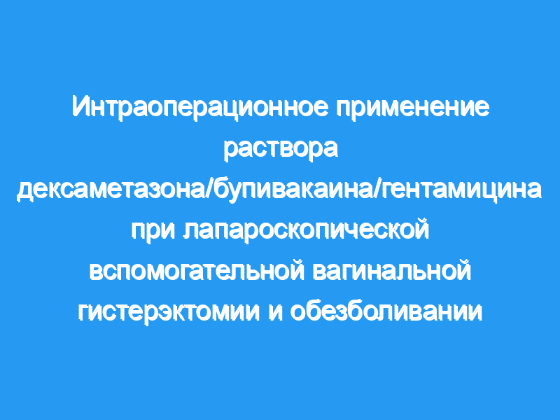 В этом проспективном рандомизированном двойном слепом исследовании двадцать женщин, проходящих ЛАВ, были случайным образом распределены на две группы лечения: (1) 100 мл раствора дексаметазона/ бупивакаина/гентамицина (DMG): 60 куб. см вводят вагинально в манжету и 40 куб. см вводят местно через лапароскопию над внутрибрюшиннымперитонеальные послеоперационные поверхности (ИП) и 5 мл бупивакаина или 5 мл физиологического раствора, вводимого в места лапароскопического разреза, (2) 100 мл физиологического раствора: 60 куб. см вводят вагинально в манжету и 40 куб. см помещают местно через лапароскопию на внутрибрюшинные послеоперационные поверхности (ИП) и вводят 5 мл бупивакаина или 5 мл физиологического раствора. в месте лапароскопического разреза.