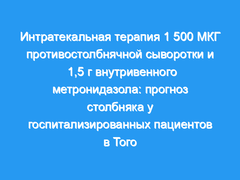 Определить влияние на клиническое прогрессирование и смертность при столбняке интратекальной терапии с использованием 1 500 МЕ гетерологичной противостолбнячной сыворотки, вводимой с 1,5 г внутривенного метронидазола. Метод: Это проспективное исследование проводилось с 1 августа 2006 года по 30 июня 2007 года и включало две группы пациентов, случайным образом распределенных для лечения двумя различными методами. Исследуемая группа из 17 пациентов получала 1 500 МЕ противостолбнячного гетерологичного иммуноглобулина интратекальным путем, а также 1,5 г внутривенного метронидазола ежедневно. Контрольная группа из 25 пациентов получала стандартное лечение в виде 9 000 МЕ гетерологичной противотанковой сыворотки, вводимой наполовину (4 500 МЕ) подкожно и наполовину внутримышечно. Были оценены клинические проявления и смертность. Классификация Молларе и оценка прогноза Дакара были использованы для классификации пациентов в соответствии с тяжестью.