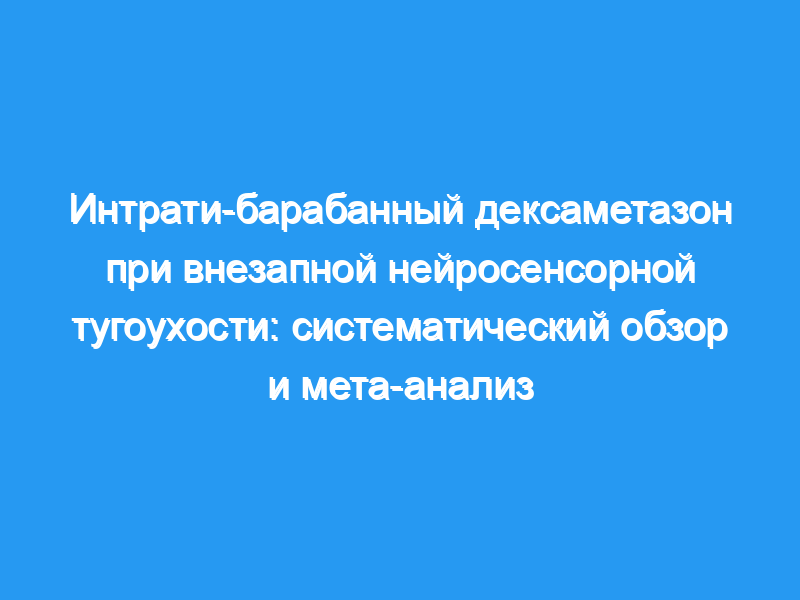 Системный дексаметазон продемонстрировал неоспоримые преимущества в устранении внезапной нейросенсорной тугоухости (SSNHL), несмотря на значительное количество потенциальных побочных эффектов. Напротив, интрати-барабанный путь введения стероидов предотвращает несколько возможных осложнений. Целью данного исследования является изучение литературы с целью определения эффективности и побочных эффектов интратимпанической инъекции дексаметазона (ИТД) для лечения ССНХЛ. Источник данных: Электронные базы данных Cochrane, Embase и MEDLINE за период с января 1950 года по август 2014 года, обновление выполнено 10 ноября 2014 года. Методы обзора: Систематический обзор и мета-анализ рандомизированных контролируемых клинических исследований (RCCT) с использованием Предпочтительных элементов отчетности для Систематических обзоров и мета-анализов, блок-схемы и руководящих принципов. Оценка качества проводилась с использованием Инструмента Кокрановского сотрудничества для оценки риска предвзятости.