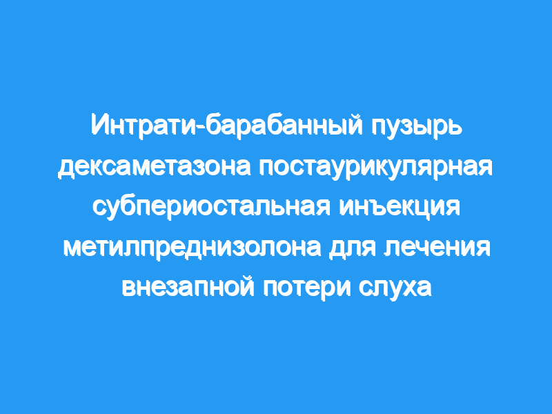Цель: сравнить эффективность и побочный эффект между интратимпанальным дексаметазоном и субпериостальной инъекцией метилпреднизолона при лечении внезапной потери слуха.Способ: В это исследование были включены сто восемь пациентов с односторонней внезапной потерей слуха, случайным образом разделенных на группу А, которой вводили интрати-барабанный дексаметазон (10 мг/мл), и группу В, которой вводили постаурикулярную субпериостальную инъекцию метилпреднизолона (40 мг/мл) каждые 3 дня внутрь. 5 раз.