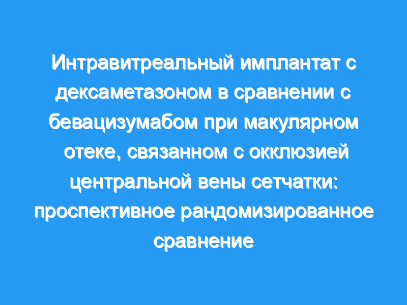 Сравнить эффективность имплантатов с дексаметазоном и инъекций бевацизумаба при макулярном отеке, вторичном по отношению к окклюзии центральной вены сетчатки. Дизайн: Рандомизированное клиническое исследование в больницах Каирского университета. Участники: Шестьдесят глаз 60 недавно диагностированных пациентов с макулярным отеком, вторичным по отношению к окклюзии центральной вены сетчатки, с наилучшей скорректированной остротой зрения 0,3 логмара (6/12) для счета пальцев, без признаков ишемии сетчатки и/или неоваскуляризации на флуоресцеиновой ангиографии и толщиной центрального подполя ≥300 мкм на глазной когерентной томографии.