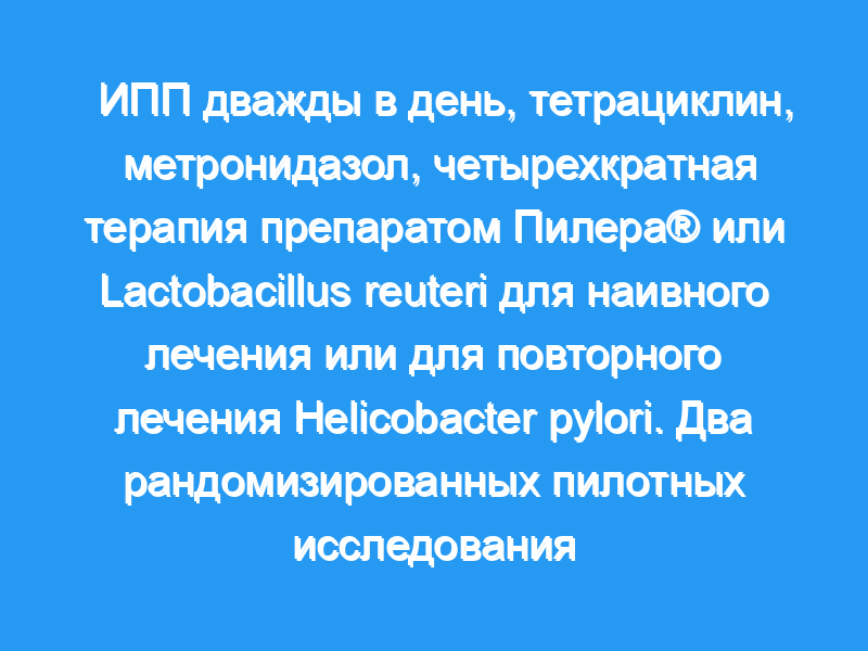 Мы провели два открытых рандомизированных пилотных исследования. Взрослые пациенты с положительным результатом на H. pylori были рандомизированы на внутривенную терапию с четырехкратной терапией, содержащей висмут (2 капсулы Pylera® плюс 250 мг тетрациклина и метронидазола в общей сложности по 500 мг каждая), или ту же дозу антибиотиков плюс 2 × 108 КОЕ Л. reuteri DSM 17 938 плюс 2 × 108 КОЕ/л reuteri ATCC PTA 6475 (Gastrus®) один раз в день и пантопразол в дозе 20 мг внутривенно во время еды в течение 10 дней. Излечение определяли с помощью отрицательного теста на 13C-UBT или антиген кала.