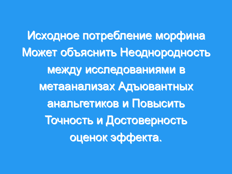Мы эмпирически определили исходное потребление морфина как основной источник неоднородности в метаанализах адъювантных анальгетиков при всех хирургических вмешательствах. Контролируя исходное потребление морфина, клиницисты могут использовать данные аудита для оценки эффекта снижения уровня морфина от добавления любого адъюванта для местного населения, независимо от того, какую операцию они проводят. Более того, мы использовали эти результаты, чтобы представить новый метод отчетности и измененный метод графического отображения оценок эффекта, который одновременно уменьшает путаницу с переменным базовым риском во включенных испытаниях и способен корректировать другие клинические и методологические переменные, приводящие к путанице. Мы рекомендуем использовать эти методы в клинической практике и будущих обзорах анальгетиков для послеоперационной боли.