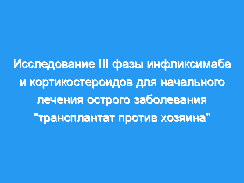 Терапия антиопухолевым фактором некроза Альфа (TNF-альфа) инфликсимабом показала свою эффективность у пациентов с резистентной к стероидам острой болезнью «трансплантат против хозяина» (aGVHD). Было проведено открытое исследование III фазы, чтобы определить, может ли добавление инфликсимаба к стероидам улучшить результаты у пациентов с впервые диагностированной аГВГД II-IV степени. В общей сложности 63 пациента были рандомизированы либо на метилпреднизолон (МП) в дозе 2 мг/кг/сут, либо на инфликсимаб+ МП. Средний возраст составил 47 лет (диапазон: 20-70 лет), 64% были mal.