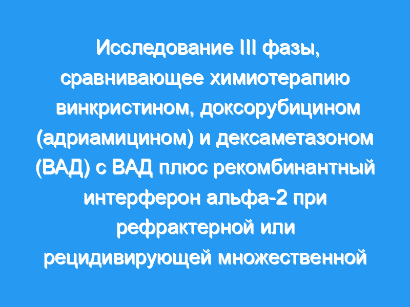 Это клиническое исследование было разработано для сравнения эффективности винкристина, доксорубицина (адриамицина) и дексаметазона (ВАД) с ВАД плюс интерферон альфа-2 у пациентов с рефрактерной или рецидивирующей множественной миеломой. Пациенты и методы: В период с января 1990 по май 1992 года 47 подходящих пациентов с множественной миеломой, которые не прошли один из предыдущих режимов химиотерапии, были включены в многоинституциональное проспективное рандомизированное клиническое исследование. Судебное разбирательство было приостановлено досрочно из-за плохого начисления.