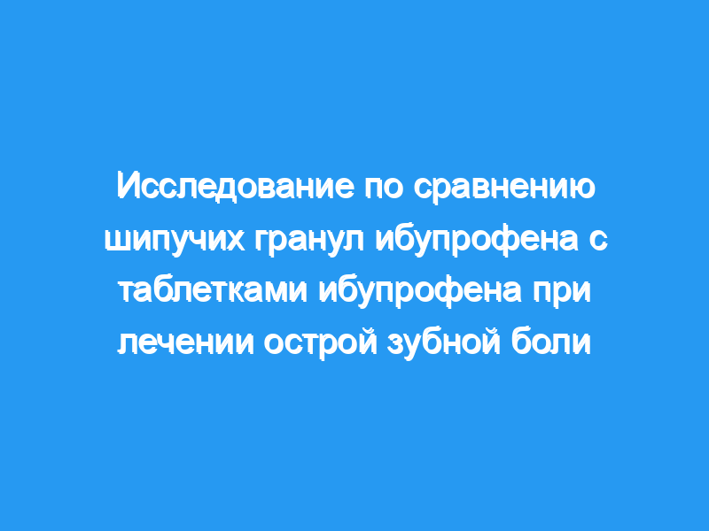В общей сложности 50 пациентов получали шипучую гранулированную форму ибупрофена 600 мг (гранулы Бруфена) в качестве исследуемого лечения, а 50 пациентов получали таблетированную форму 600 мг в этом слепом исследовании с несколькими дозами в параллельных группах. Операция проводилась под общим наркозом одним или двумя хирургами-стоматологами. Пациенты получали либо один пакетик гранул ибупрофена, либо одну таблетку ибупрофена с шестичасовыми интервалами в течение 24 часов, как только послеоперационная боль становилась от умеренной до сильной. Результаты: Было показано, что оба метода лечения эффективны при лечении послеоперационной зубной боли. Было обнаружено, что гранулы обеспечивают значительно лучшее обезболивание в первые 30 минут после приема первой дозы. Это может быть связано с более быстрым всасыванием препарата из гранул у этих пациентов и/или местным действием ибупрофена в растворе во рту.